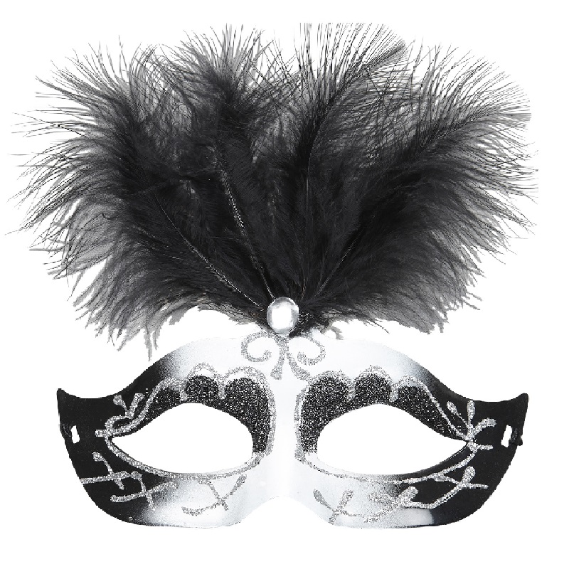 -20%Enkel sort og hvit maskerademaske med sølvglitter og fjær.