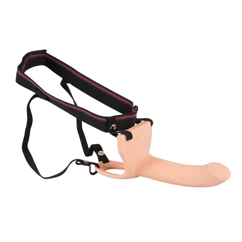 Hul penisdildo med vibrasjon og fast forlengende hodeformet tupp, festet på elastisk strap-on belte. Den hule strap-on dildoen har 10 vibrasjonsmodus per tastetrykk, og er perfekt for menn som vil yte litt mer i lengde og omfang under sex. Penisdildoen har også pungring ved basen. I tillegg føler sexpartneren seg deilig oppfylt, og stimuleres av 10 avvekslende vibrasjonsmodus. Oppladbar med vedlagt USB-ladekabel.